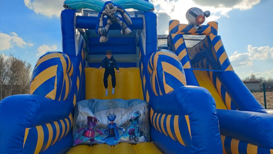 Strefa robotów to dwie atrakcje w jednym urządzeniu - z prawej strony znajduje się zjeżdżalnia, a z lewej dla odważnych czeka miejsce do skakania!
